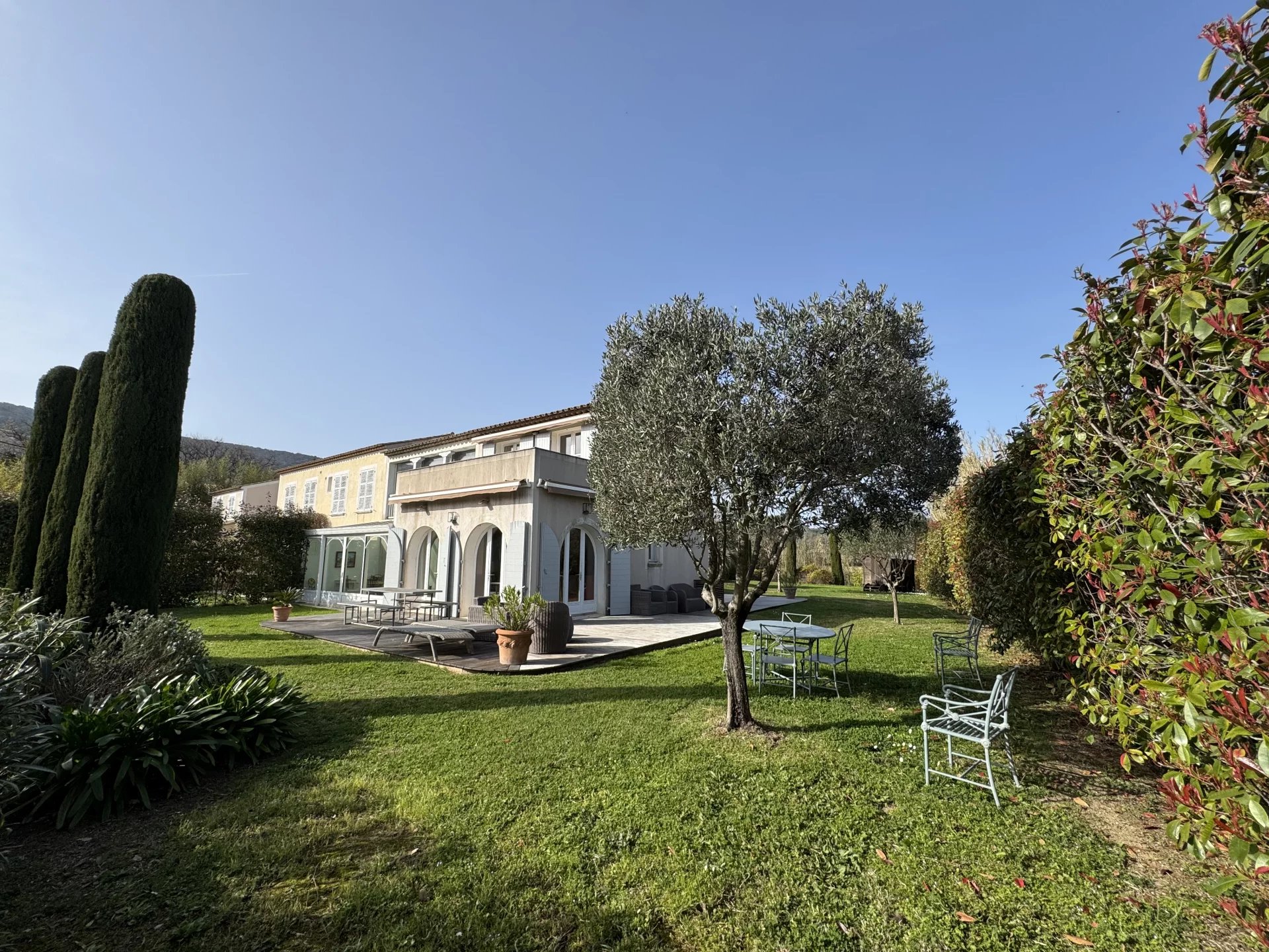 A 600 m du village pittoresque de Ramatuelle, jolie maison mitoyenne d'un côté de 126 m2 environ (78,36 m2 LC), sur 2 niveaux, en retrait de la route avec beau jardin de 1000 m2 environ, exposé Sud, Sud-Est. Elle se compose d'une entrée, WC invités, salon et cuisine à l'américaine, le tout ouvrant sur le jardin & les terrasses, véranda faisant office de salle à manger, 3 chambres, 2 salles d'eau et WC, rangement. A l'étage, chambre principale ouvrant sur belle terrasse avec vue sur le Cap Camarat et les collines environnantes, salle de bains & WC, loggia/bureau. Au coeur d'une petite copropriété de 3 lots uniquement, avec piscine commune et parking libre de 2 places. Accès privé & fermé. Au calme, une situation idéale pour un pied à terre proche du village et à seulement 3 km des plages de Pampelonne...